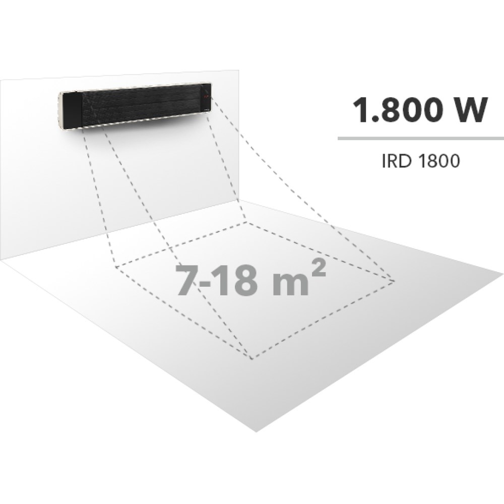 IRD 1800 omogućava ravnomjernu i preciznu distribuciju topline. Zato je ovaj uređaj idealan za prostorije zaštićene od vjetra kao što su terase, balkoni, terase restorana i zatvoreni prostori kao što su bazeni, šatori ili privremeno korišteni prostori.
